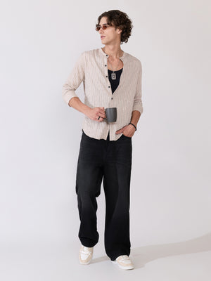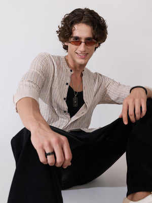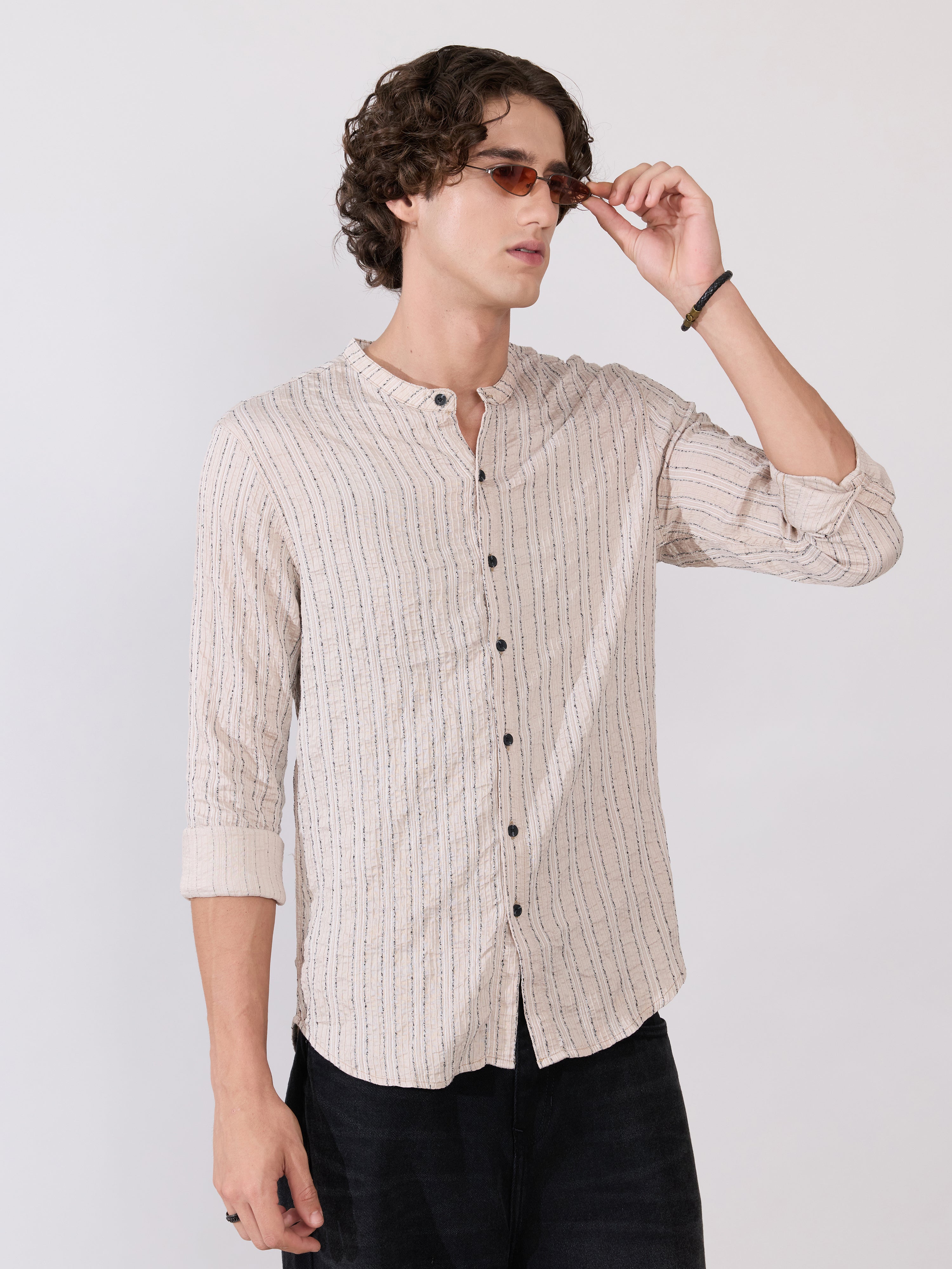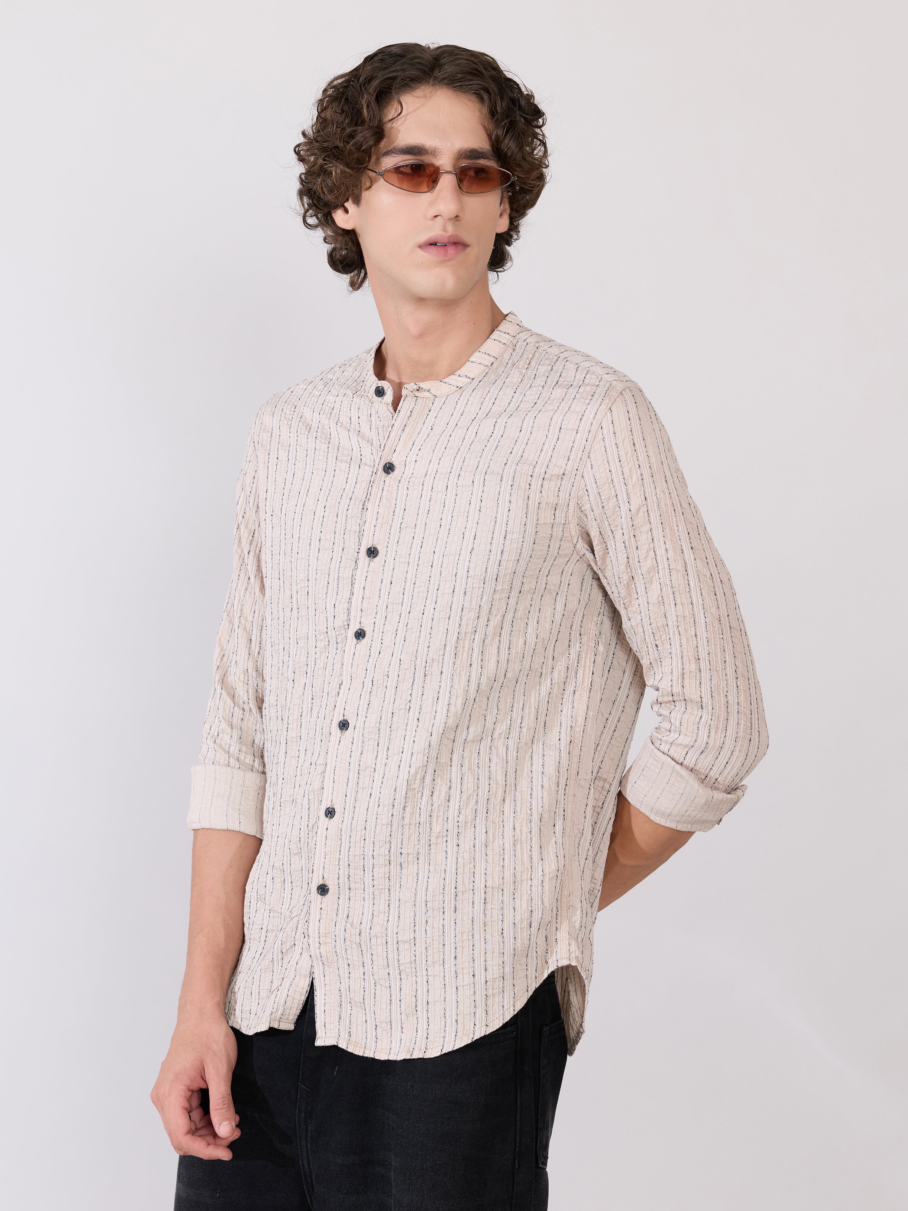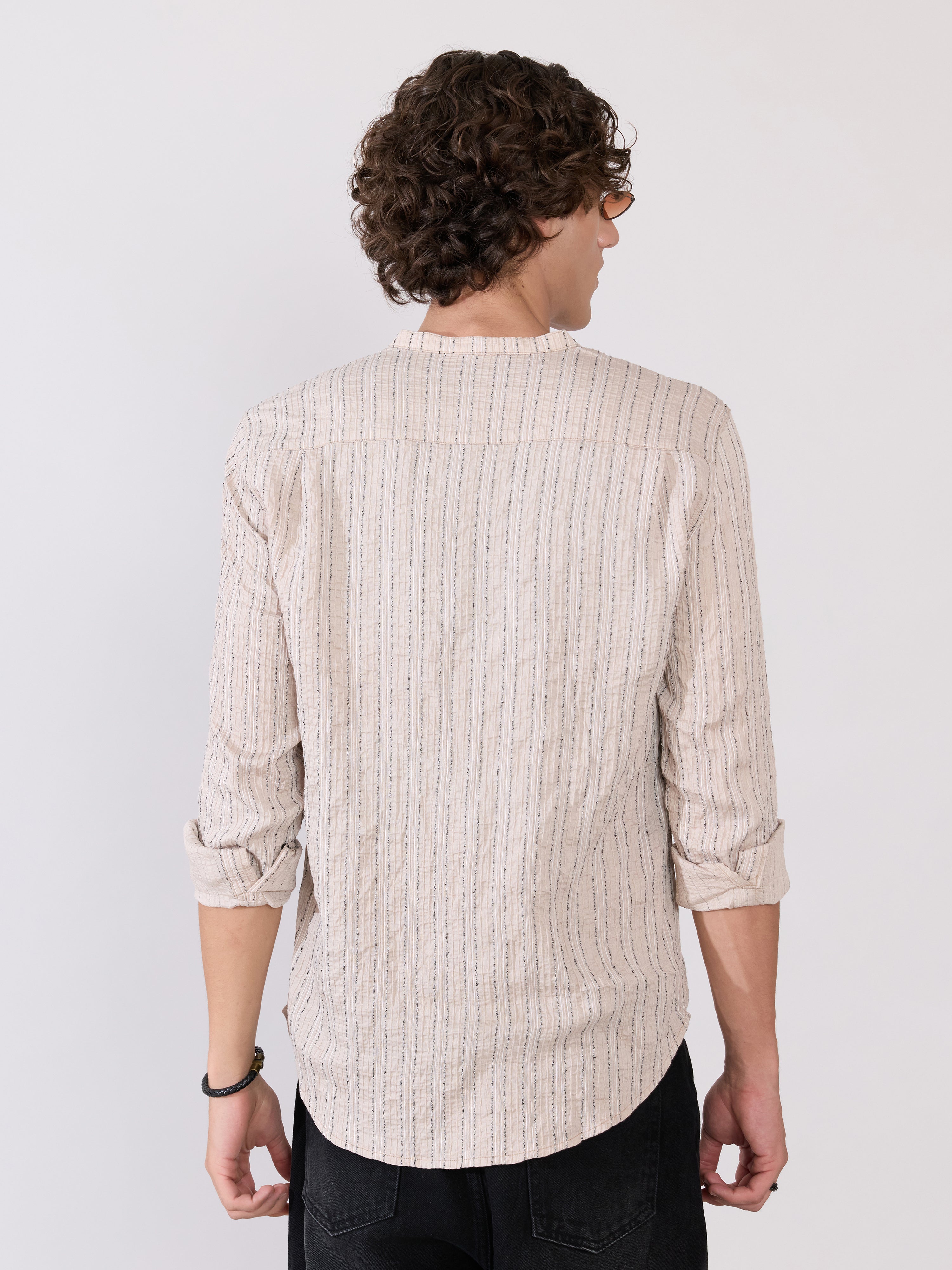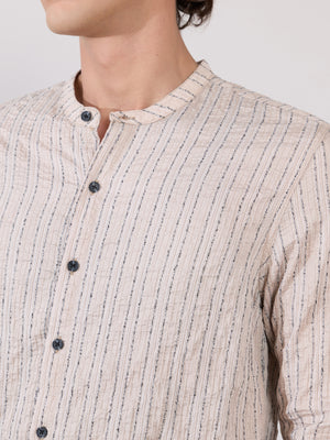 Aumena - Crinkle Pattern Striped Band Neck Shirt - Beige