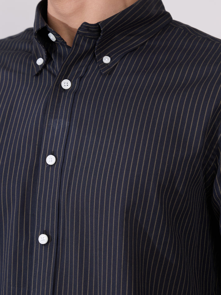 The Erzela Smart Fit Striped Shirt in Black blends sharp tailoring with modern minimal style. Crafted from pure cotton, it offers a crisp structure, breathable comfort, and a polished appearance that works effortlessly for smart-casual looks. The subtle vertical stripes enhance your frame, giving you a clean and elevated silhouette suitable for workdays, meetings, and refined evening outings