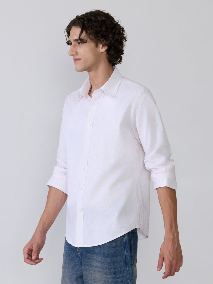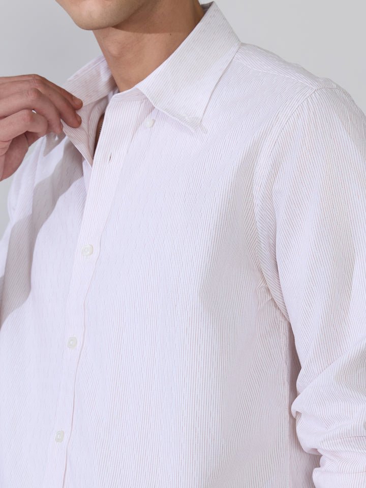 The Erzela Smart Fit Striped Shirt in Peach blends sharp tailoring with modern minimal style. Crafted from pure cotton, it offers a crisp structure, breathable comfort, and a polished appearance that works effortlessly for smart-casual looks. The subtle vertical stripes enhance your frame, giving you a clean and elevated silhouette suitable for workdays, meetings, and refined evening outings
