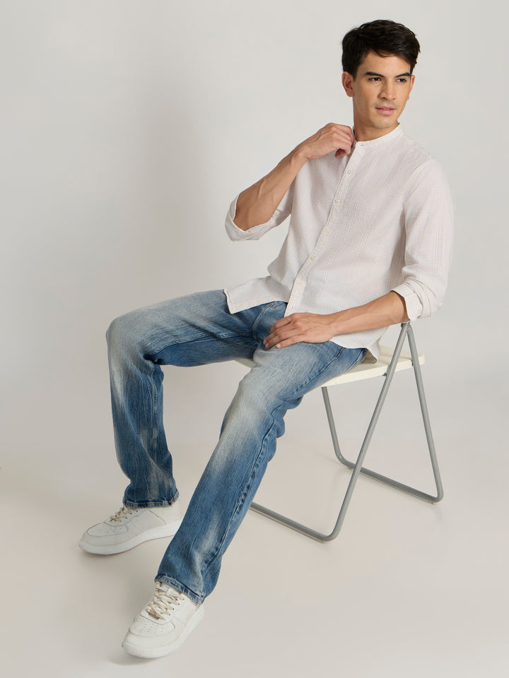 The Hadrian Band Collar Checks Shirt in light Peach redefines everyday elegance with its authentic appeal. Crafted from pure cotton, it offers a naturally soft and breathable feel that keeps you comfortable all day. The subtle check pattern and clean band collar design make it a versatile piece, perfect for both casual outings and smart layering. A timeless essential for the modern wardrobe.