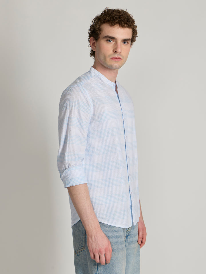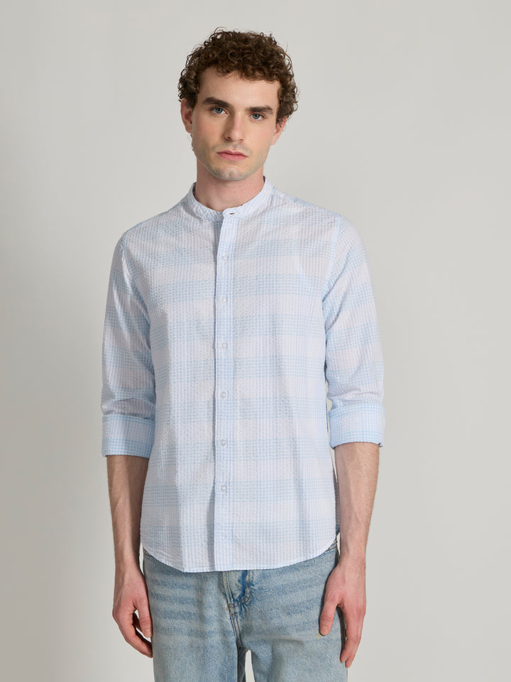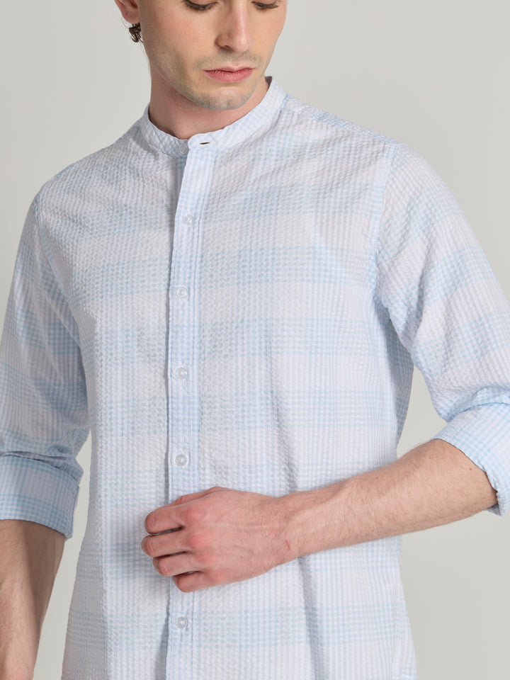 Hadrian - Band Collar Checks Shirt - Sky Blue