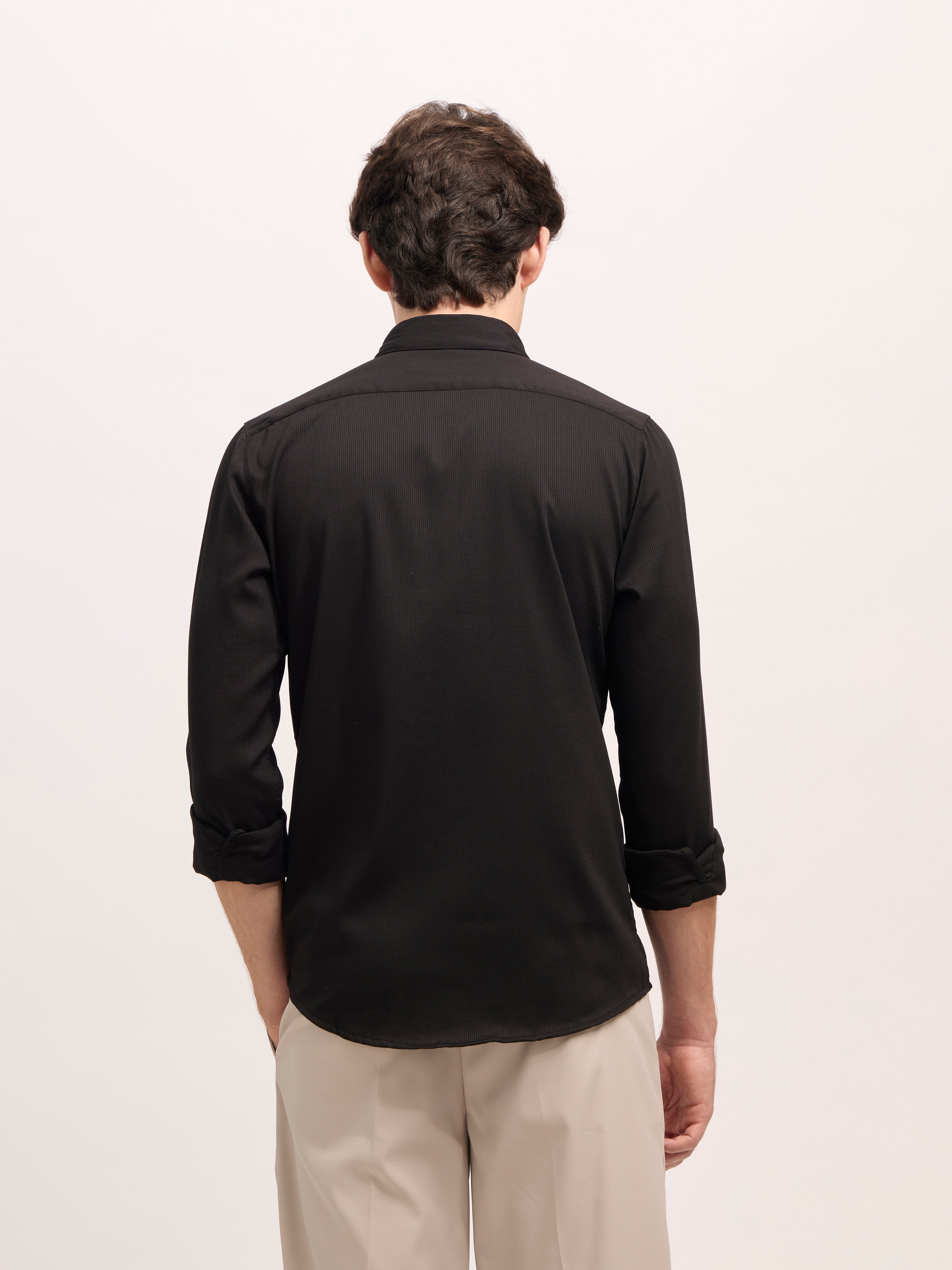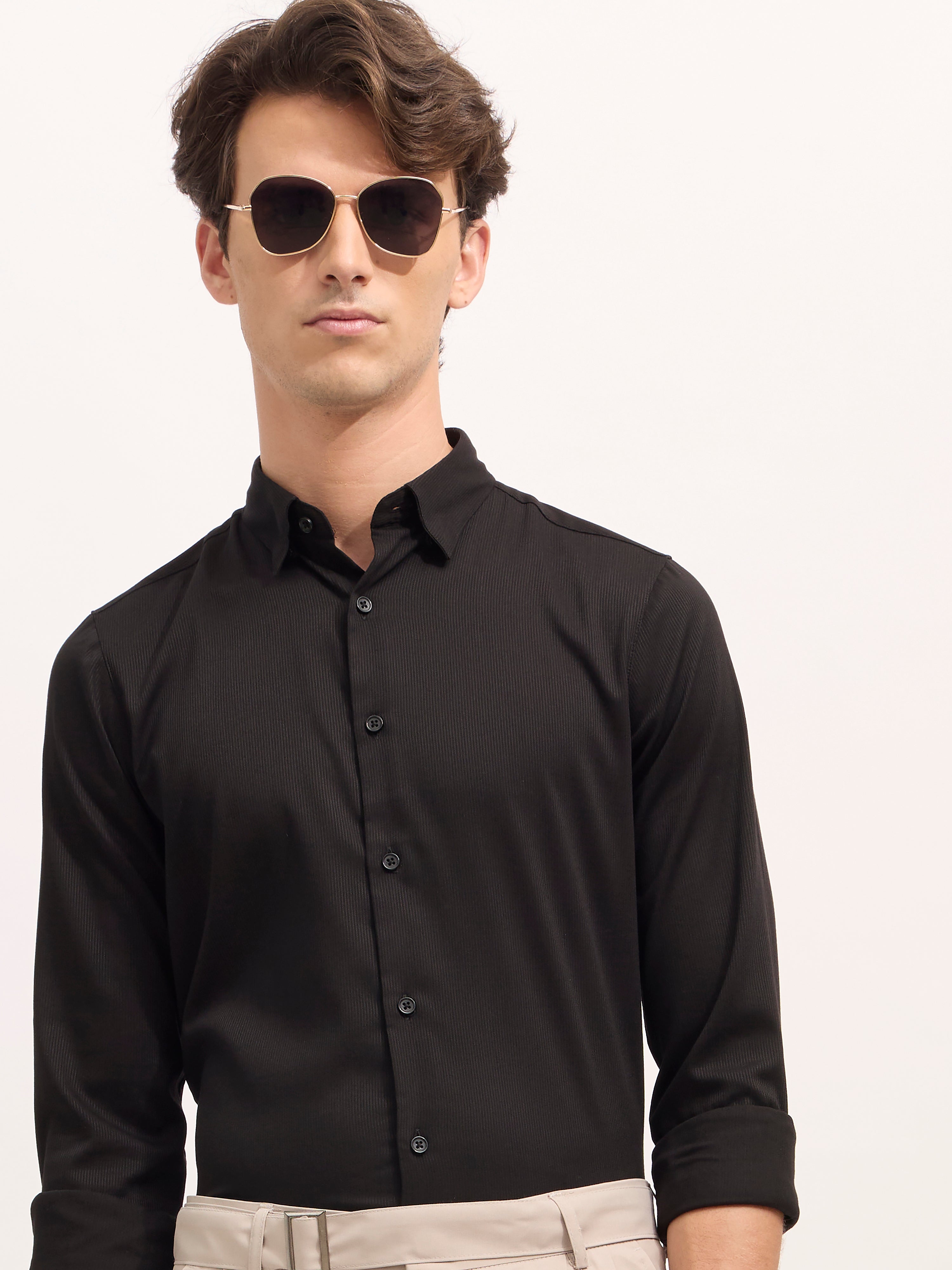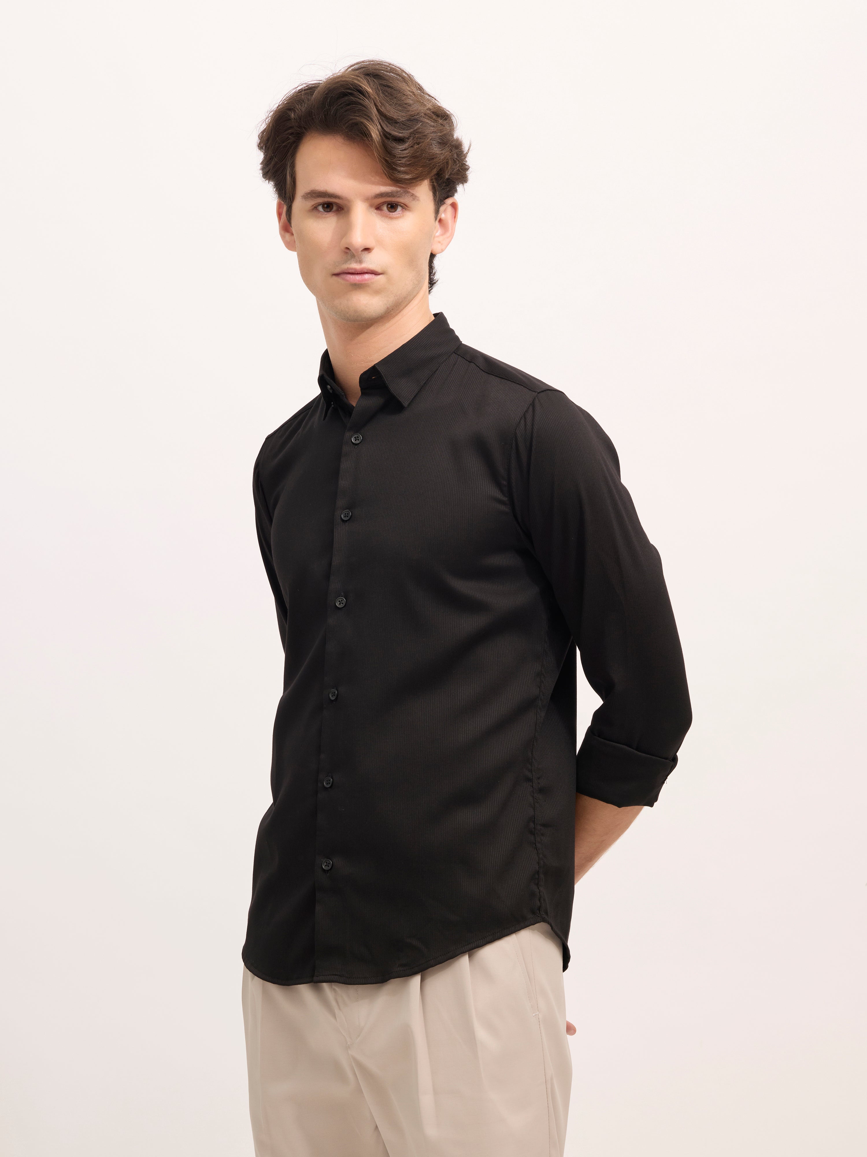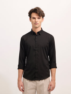 Refresh your wardrobe with the Ivar Striped Turkish Fit Shirt in a sophisticated Black. Crafted from soft, breathable cotton, this shirt brings everyday comfort and refined styling. The vertical thin striped pattern adds a touch of elegance, creating a flattering structure while keeping the look effortlessly casual. Designed with a slim turkish fit, full sleeves, and a spread collar, it's ideal for everything from laid-back office wear to weekend gatherings. Pair it with chinos or denim for a sharp, versatile outfit.