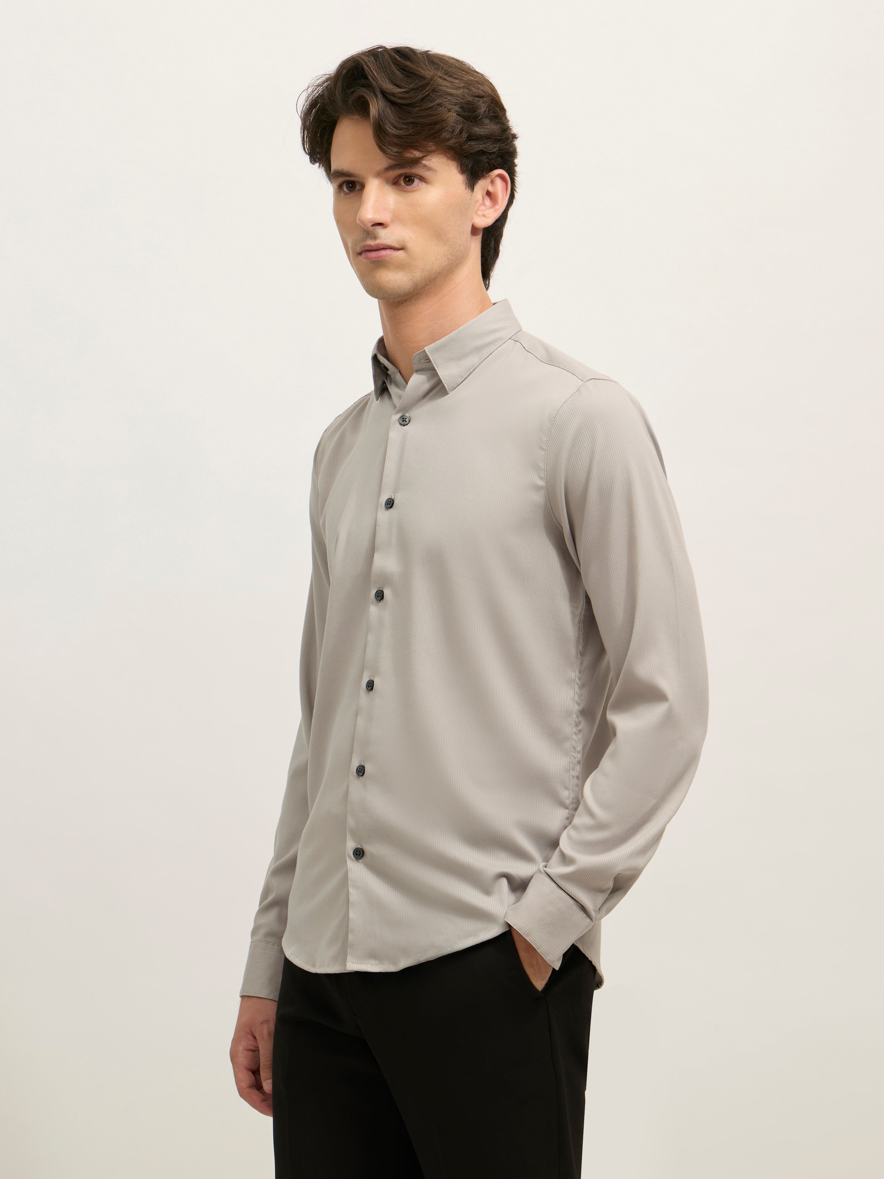 Refresh your wardrobe with the Ivar Striped Turkish Fit Shirt in a sophisticated Gray tone. Crafted from soft, breathable cotton, this shirt brings everyday comfort and refined styling. The vertical thin striped pattern adds a touch of elegance, creating a flattering structure while keeping the look effortlessly casual. Designed with a slim turkish fit, full sleeves, and a spread collar, it's ideal for everything from laid-back office wear to weekend gatherings. Pair it with chinos or denim for a sharp, versatile outfit.