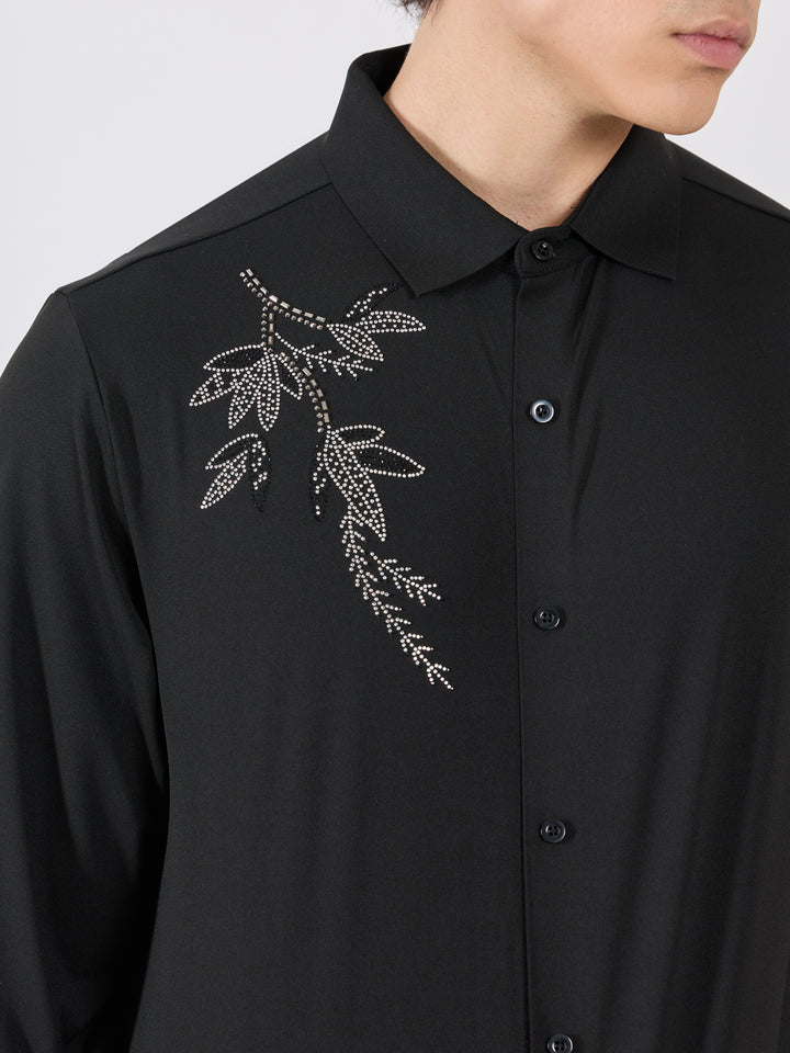 Make a bold yet elegant statement with the Osmond - Leaf Design Embellished with stone in Black. Crafted with Nylon-Spandex blend, this shirt features intricate floral embellishments across the shoulder and chest, blending artistry with modern sophistication. Perfect for evenings, parties, or standout occasions where subtle luxury matters.
