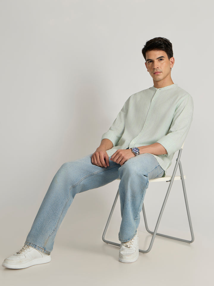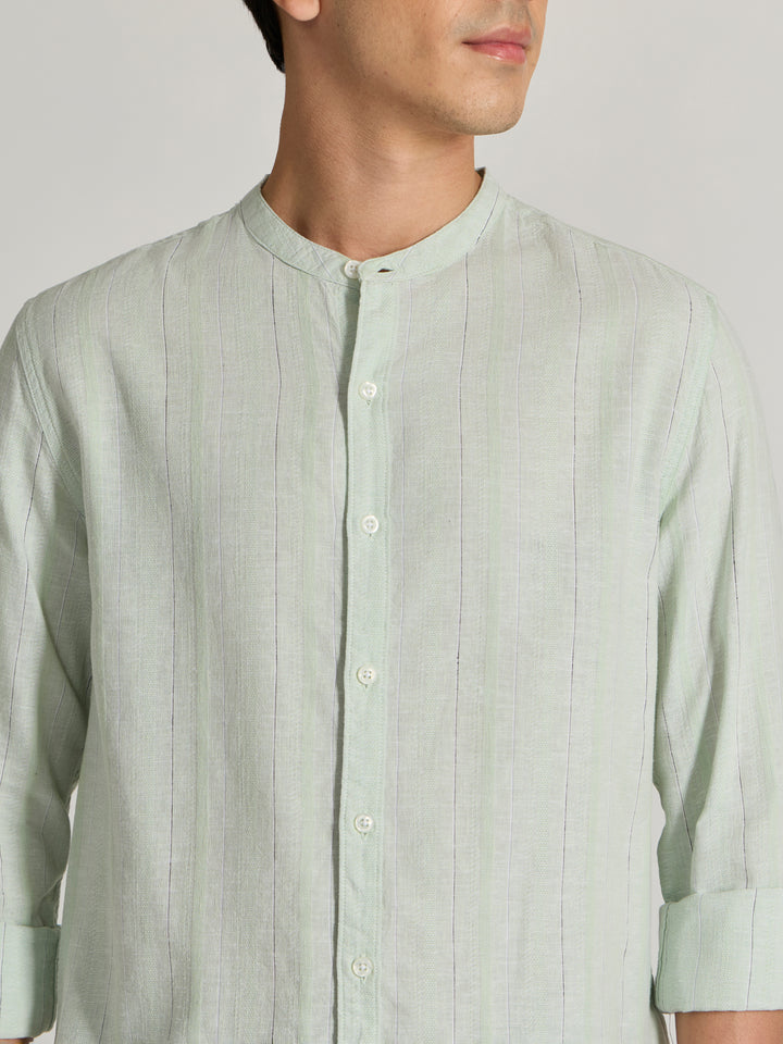 The Salvator Band Collar Striped Shirt in light Green brings understated elegance with a modern edge. Crafted from pure cotton, it offers natural breathability and a soft hand feel, making it a true essential for all-day comfort. The relaxed fit ensures easy movement, while the vertical stripes and band collar create a sharp, contemporary look. A versatile choice for smart-casual dressing.