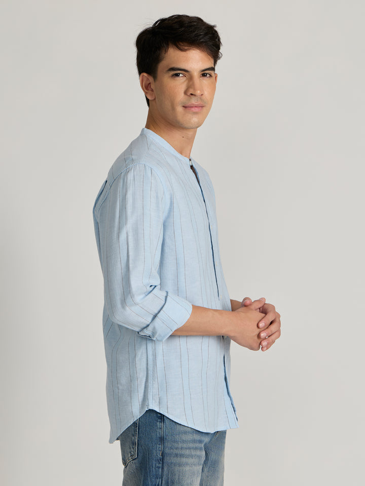 Salvator - Band Collar Striped Shirt - Sky Blue
