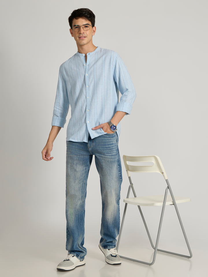 The Salvator Band Collar Striped Shirt in Sky Blue brings understated elegance with a modern edge. Crafted from pure cotton, it offers natural breathability and a soft hand feel, making it a true essential for all-day comfort. The relaxed fit ensures easy movement, while the vertical stripes and band collar create a sharp, contemporary look. A versatile choice for smart-casual dressing.