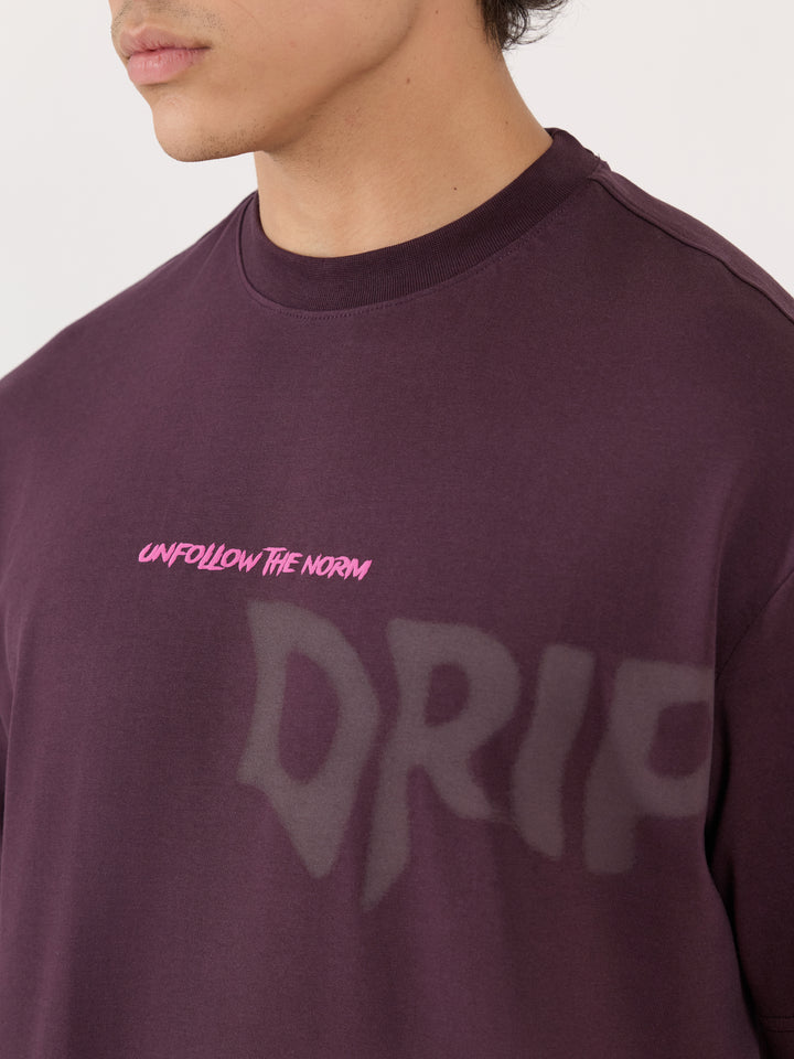 Sheldon - Drip Printed Dark Plum Loose Fit T-Shirt